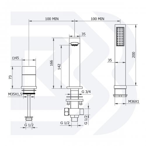 Batteria da bordo vasca 3 fori con doccia